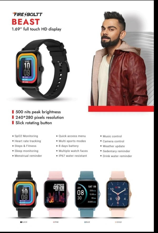 The Fire-Boltt Beast SPO2 fitness smartwatch has an HD display with a brightness of 500 nits that makes it clearly visible. It features a metal body and shows real-time SPO2 level, has blood pressure tracking and dynamic heart rate monitoring features.
